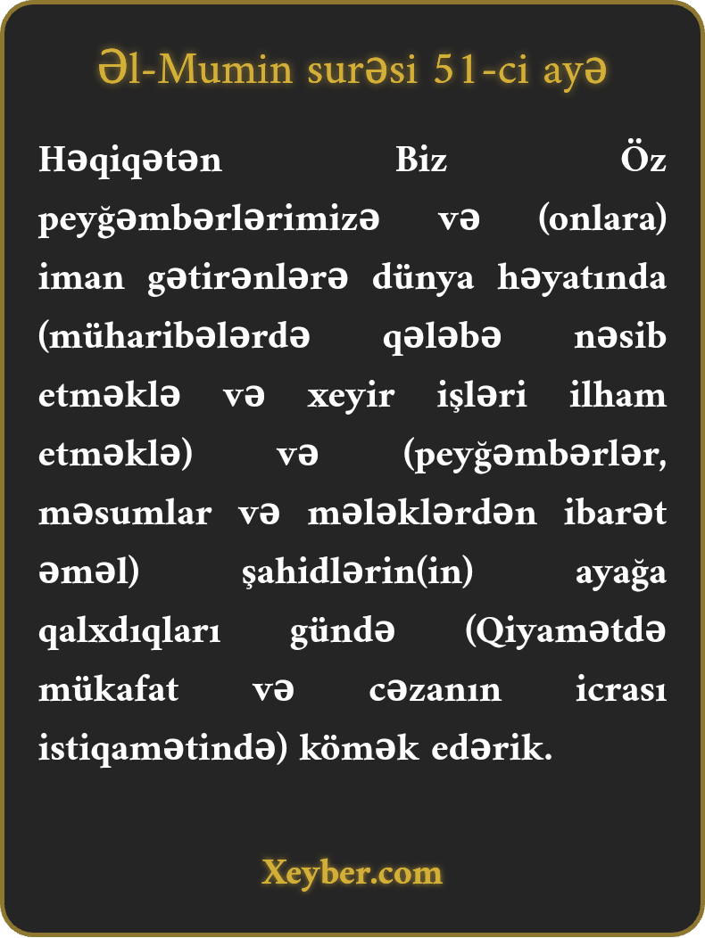 Həqiqətən Biz Öz peyğəmbərlərimizə və (onlara) iman gətirənlərə dünya həyatında (müharibələrdə qələbə nəsib etməklə və xeyir işləri ilham etməklə) və (peyğəmbərlər, məsumlar və mələklərdən ibarət əməl) şahidlərin(in) ayağa qalxdıqları gündə (Qiyamətdə mükafat və cəzanın icrası istiqamətində) kömək edərik.