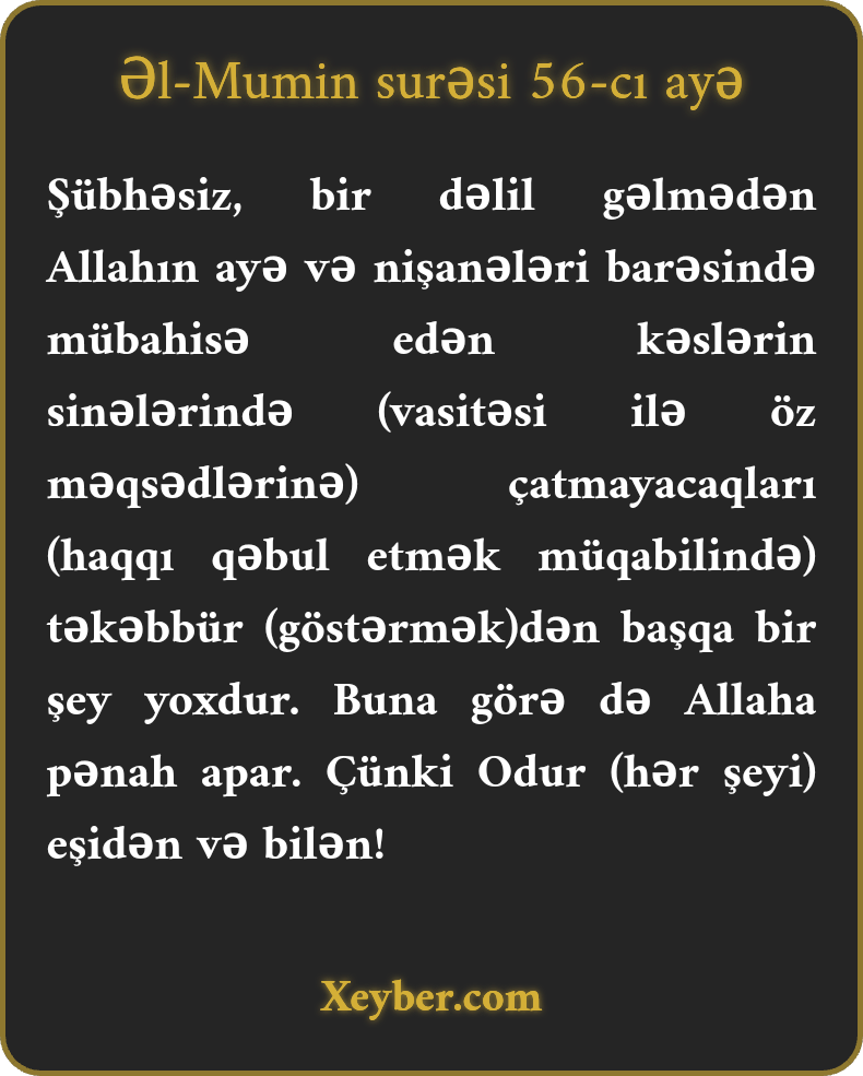 Şübhəsiz, bir dəlil gəlmədən Allahın ayə və nişanələri barəsində mübahisə edən kəslərin sinələrində (vasitəsi ilə öz məqsədlərinə) çatmayacaqları (haqqı qəbul etmək müqabilində) təkəbbür (göstərmək)dən başqa bir şey yoxdur. Buna görə də Allaha pənah apar. Çünki Odur (hər şeyi) eşidən və bilən!