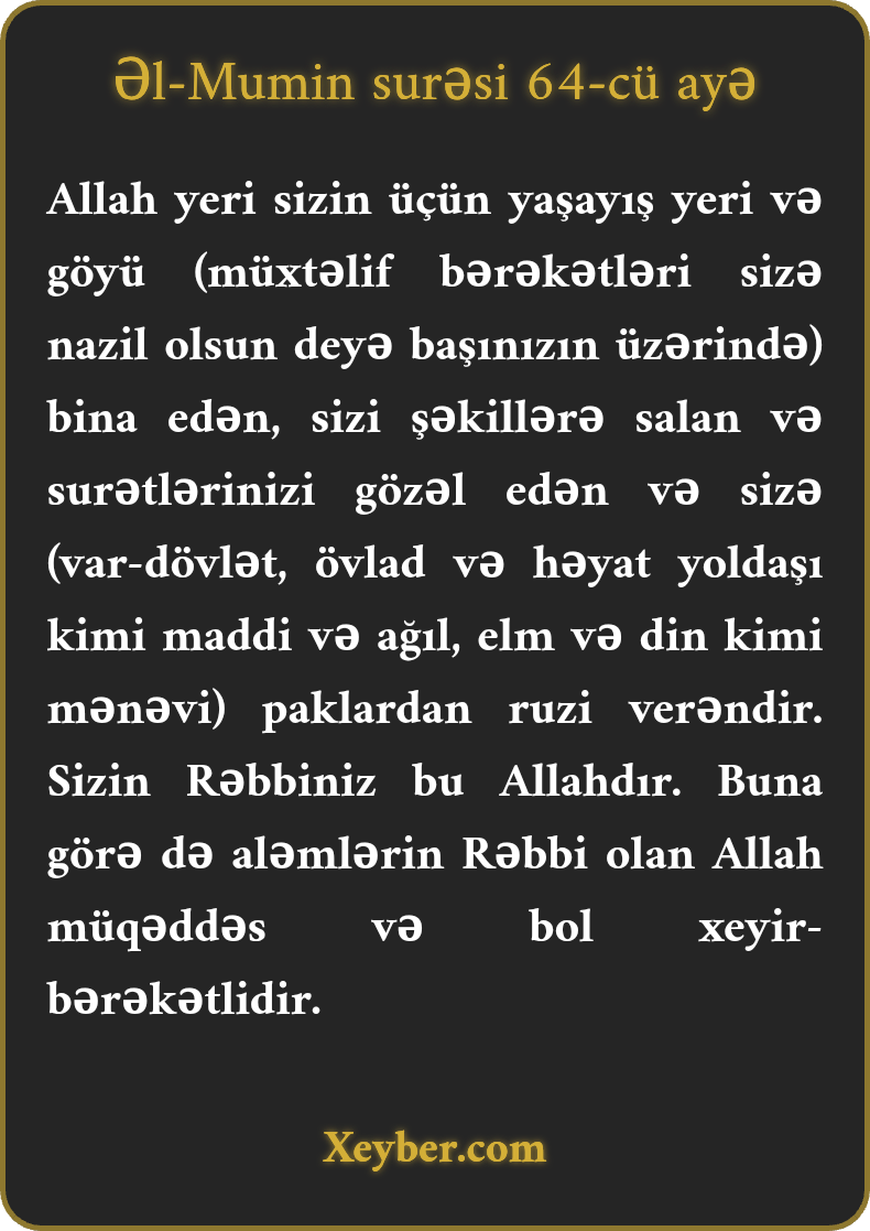 Allah yeri sizin üçün yaşayış yeri və göyü (müxtəlif bərəkətləri sizə nazil olsun deyə başınızın üzərində) bina edən, sizi şəkillərə salan və surətlərinizi gözəl edən və sizə (var-dövlət, övlad və həyat yoldaşı kimi maddi və ağıl, elm və din kimi mənəvi) paklardan ruzi verəndir. Sizin Rəbbiniz bu Allahdır. Buna görə də aləmlərin Rəbbi olan Allah müqəddəs və bol xeyir-bərəkətlidir.