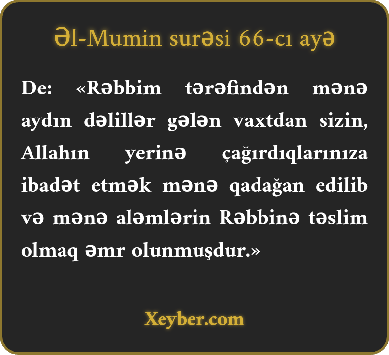 De: «Rəbbim tərəfindən mənə aydın dəlillər gələn vaxtdan sizin, Allahın yerinə çağırdıqlarınıza ibadət etmək mənə qadağan edilib və mənə aləmlərin Rəbbinə təslim olmaq əmr olunmuşdur.»