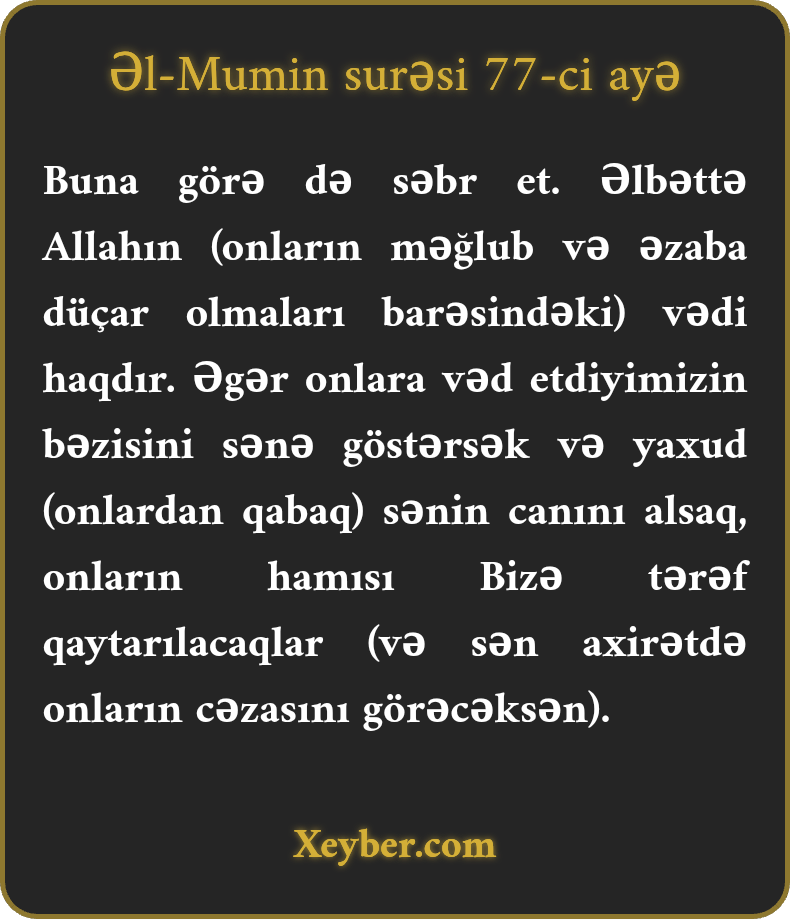 Buna görə də səbr et. Əlbəttə Allahın (onların məğlub və əzaba düçar olmaları barəsindəki) vədi haqdır. Əgər onlara vəd etdiyimizin bəzisini sənə göstərsək və yaxud (onlardan qabaq) sənin canını alsaq, onların hamısı Bizə tərəf qaytarılacaqlar (və sən axirətdə onların cəzasını görəcəksən).