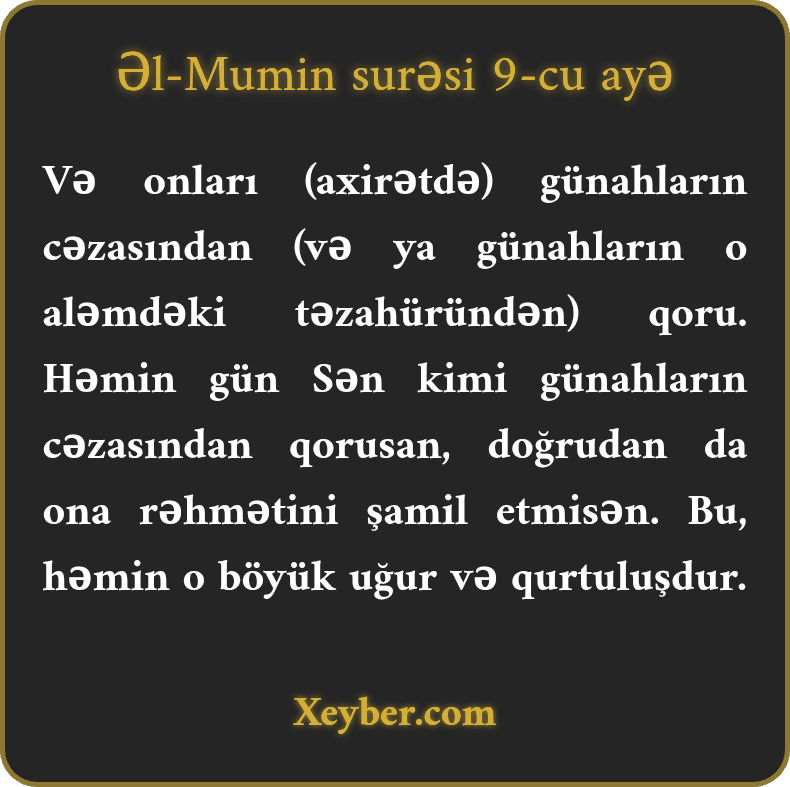 Və onları (axirətdə) günahların cəzasından (və ya günahların o aləmdəki təzahüründən) qoru. Həmin gün Sən kimi günahların cəzasından qorusan, doğrudan da ona rəhmətini şamil etmisən. Bu, həmin o böyük uğur və qurtuluşdur.