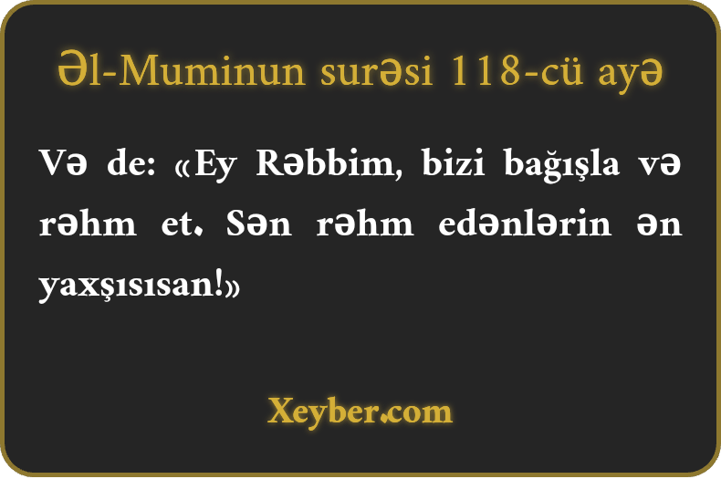 Və de: «Ey Rəbbim, bizi bağışla və rəhm et. Sən rəhm edənlərin ən yaxşısısan!»