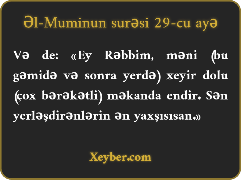 Və de: «Ey Rəbbim, məni (bu gəmidə və sonra yerdə) xeyir dolu (çox bərəkətli) məkanda endir. Sən yerləşdirənlərin ən yaxşısısan.»