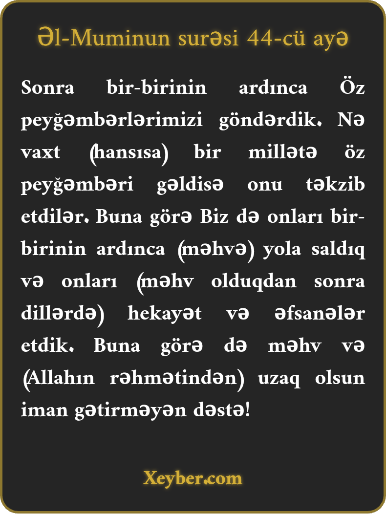 Sonra bir-birinin ardınca Öz peyğəmbərlərimizi göndərdik. Nə vaxt (hansısa) bir millətə öz peyğəmbəri gəldisə onu təkzib etdilər. Buna görə Biz də onları bir-birinin ardınca (məhvə) yola saldıq və onları (məhv olduqdan sonra dillərdə) hekayət və əfsanələr etdik. Buna görə də məhv və (Allahın rəhmətindən) uzaq olsun iman gətirməyən dəstə!