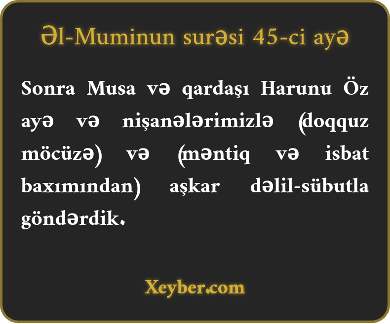 Sonra Musa və qardaşı Harunu Öz ayə və nişanələrimizlə (doqquz möcüzə) və (məntiq və isbat baxımından) aşkar dəlil-sübutla göndərdik.