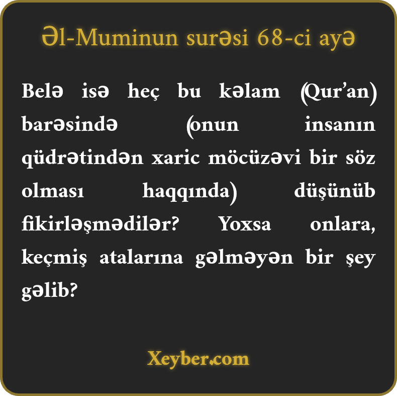 Belə isə heç bu kəlam (Qur’an) barəsində (onun insanın qüdrətindən xaric möcüzəvi bir söz olması haqqında) düşünüb fikirləşmədilər? Yoxsa onlara, keçmiş atalarına gəlməyən bir şey gəlib?