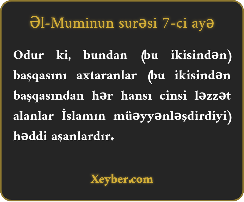 Odur ki, bundan (bu ikisindən) başqasını axtaranlar (bu ikisindən başqasından hər hansı cinsi ləzzət alanlar İslamın müəyyənləşdirdiyi) həddi aşanlardır.