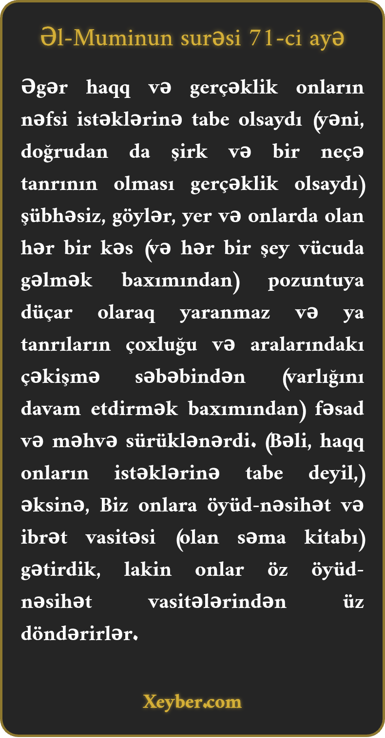 Əgər haqq və gerçəklik onların nəfsi istəklərinə tabe olsaydı (yəni, doğrudan da şirk və bir neçə tanrının olması gerçəklik olsaydı) şübhəsiz, göylər, yer və onlarda olan hər bir kəs (və hər bir şey vücuda gəlmək baxımından) pozuntuya düçar olaraq yaranmaz və ya tanrıların çoxluğu və aralarındakı çəkişmə səbəbindən (varlığını davam etdirmək baxımından) fəsad və məhvə sürüklənərdi. (Bəli, haqq onların istəklərinə tabe deyil,) əksinə, Biz onlara öyüd-nəsihət və ibrət vasitəsi (olan səma kitabı) gətirdik, lakin onlar öz öyüd-nəsihət vasitələrindən üz döndərirlər.