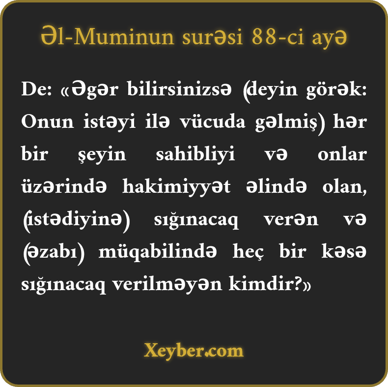 De: «Əgər bilirsinizsə (deyin görək: Onun istəyi ilə vücuda gəlmiş) hər bir şeyin sahibliyi və onlar üzərində hakimiyyət əlində olan, (istədiyinə) sığınacaq verən və (əzabı) müqabilində heç bir kəsə sığınacaq verilməyən kimdir?»