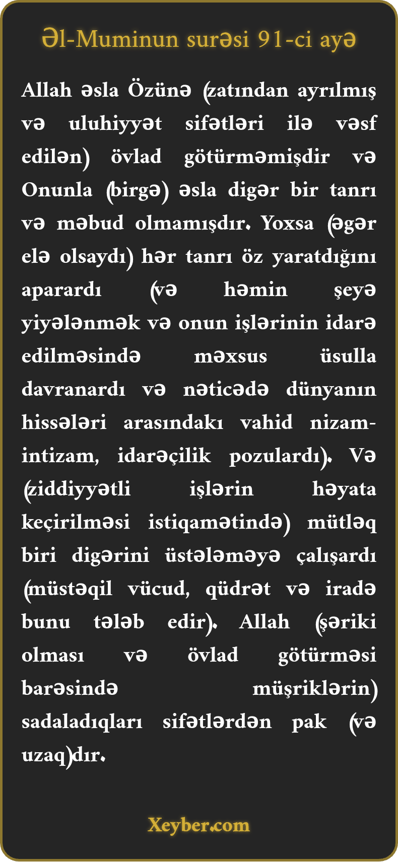 Allah əsla Özünə (zatından ayrılmış və uluhiyyət sifətləri ilə vəsf edilən) övlad götürməmişdir və Onunla (birgə) əsla digər bir tanrı və məbud olmamışdır. Yoxsa (əgər elə olsaydı) hər tanrı öz yaratdığını aparardı (və həmin şeyə yiyələnmək və onun işlərinin idarə edilməsində məxsus üsulla davranardı və nəticədə dünyanın hissələri arasındakı vahid nizam-intizam, idarəçilik pozulardı). Və (ziddiyyətli işlərin həyata keçirilməsi istiqamətində) mütləq biri digərini üstələməyə çalışardı (müstəqil vücud, qüdrət və iradə bunu tələb edir). Allah (şəriki olması və övlad götürməsi barəsində müşriklərin) sadaladıqları sifətlərdən pak (və uzaq)dır.
