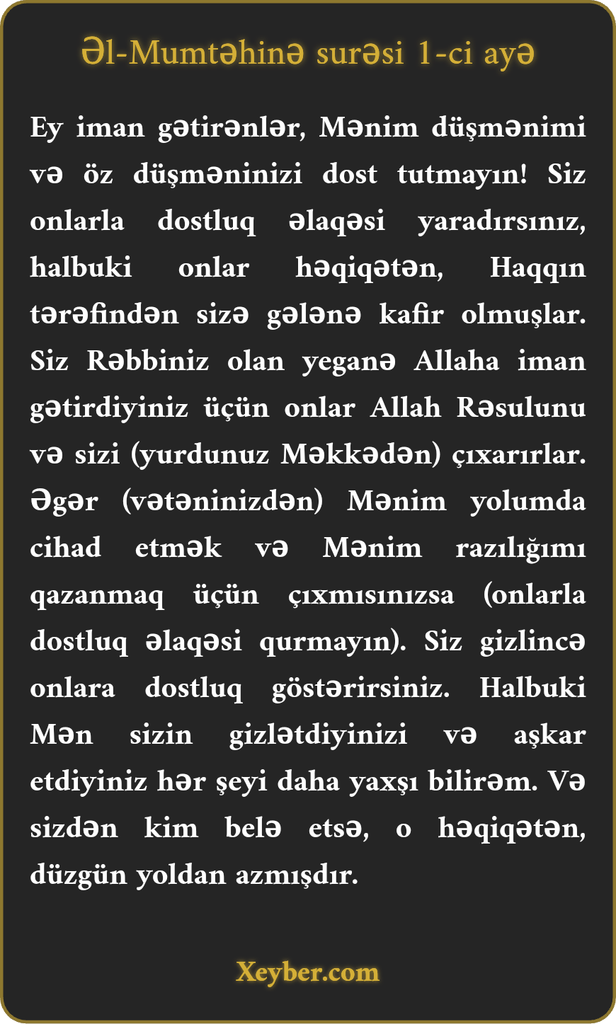 Ey iman gətirənlər, Mənim düşmənimi və öz düşməninizi dost tutmayın! Siz onlarla dostluq əlaqəsi yaradırsınız, halbuki onlar həqiqətən, Haqqın tərəfindən sizə gələnə kafir olmuşlar. Siz Rəbbiniz olan yeganə Allaha iman gətirdiyiniz üçün onlar Allah Rəsulunu və sizi (yurdunuz Məkkədən) çıxarırlar. Əgər (vətəninizdən) Mənim yolumda cihad etmək və Mənim razılığımı qazanmaq üçün çıxmısınızsa (onlarla dostluq əlaqəsi qurmayın). Siz gizlincə onlara dostluq göstərirsiniz. Halbuki Mən sizin gizlətdiyinizi və aşkar etdiyiniz hər şeyi daha yaxşı bilirəm. Və sizdən kim belə etsə, o həqiqətən, düzgün yoldan azmışdır.