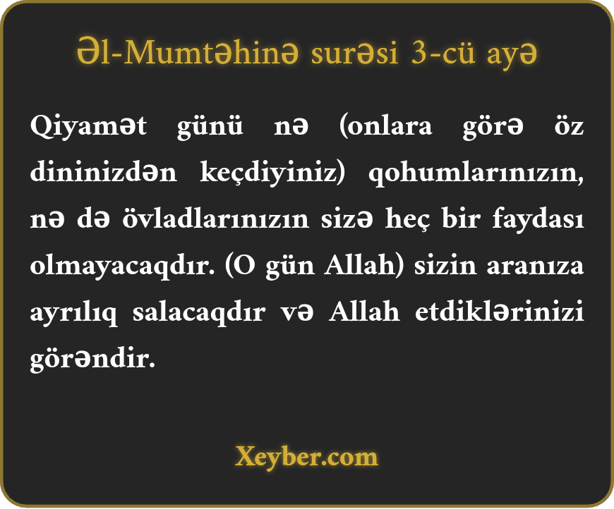 Qiyamət günü nə (onlara görə öz dininizdən keçdiyiniz) qohumlarınızın, nə də övladlarınızın sizə heç bir faydası olmayacaqdır. (O gün Allah) sizin aranıza ayrılıq salacaqdır və Allah etdiklərinizi görəndir.
