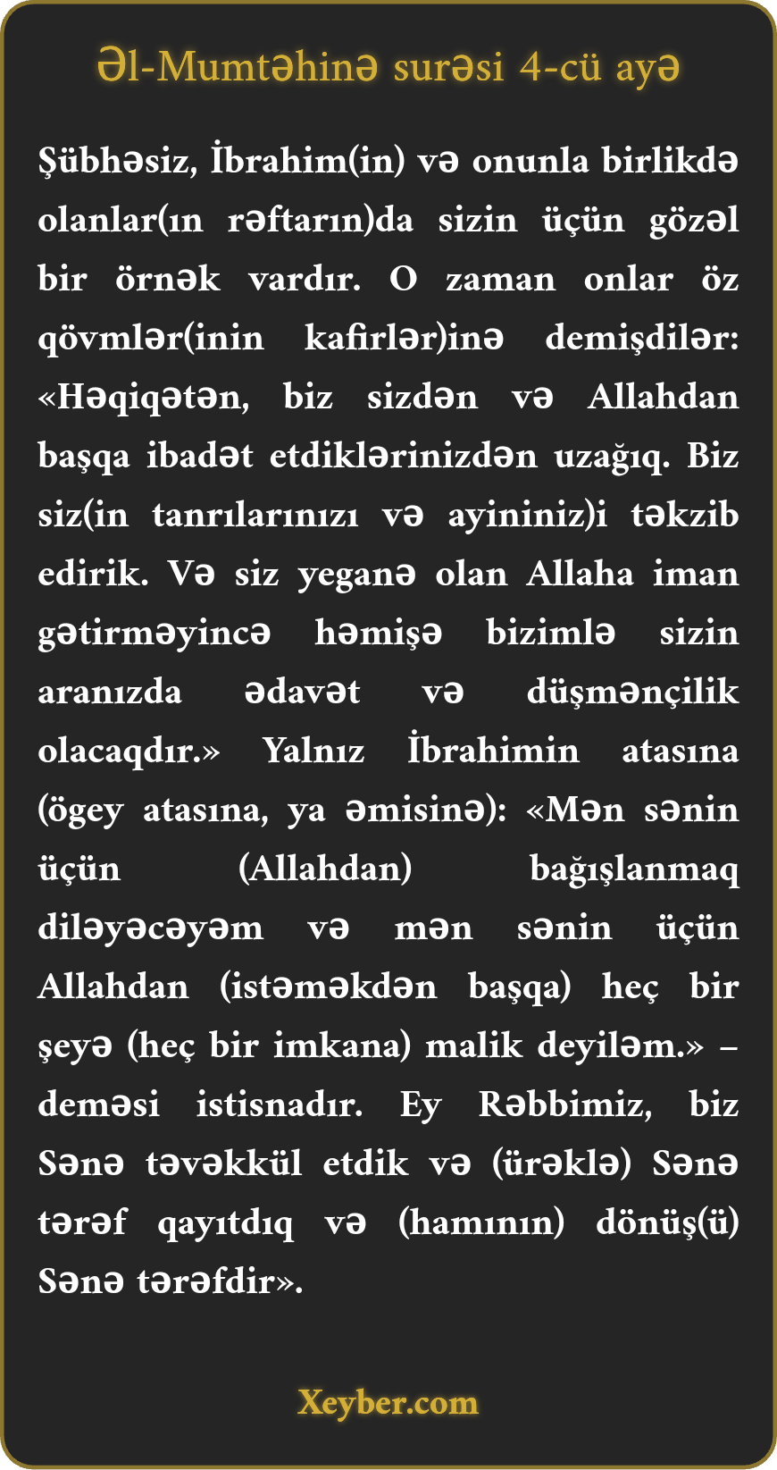 Şübhəsiz, İbrahim(in) və onunla birlikdə olanlar(ın rəftarın)da sizin üçün gözəl bir örnək vardır. O zaman onlar öz qövmlər(inin kafirlər)inə demişdilər: «Həqiqətən, biz sizdən və Allahdan başqa ibadət etdiklərinizdən uzağıq. Biz siz(in tanrılarınızı və ayininiz)i təkzib edirik. Və siz yeganə olan Allaha iman gətirməyincə həmişə bizimlə sizin aranızda ədavət və düşmənçilik olacaqdır.» Yalnız İbrahimin atasına (ögey atasına, ya əmisinə): «Mən sənin üçün (Allahdan) bağışlanmaq diləyəcəyəm və mən sənin üçün Allahdan (istəməkdən başqa) heç bir şeyə (heç bir imkana) malik deyiləm.» –deməsi istisnadır. Ey Rəbbimiz, biz Sənə təvəkkül etdik və (ürəklə) Sənə tərəf qayıtdıq və (hamının) dönüş(ü) Sənə tərəfdir».