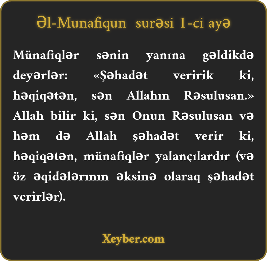 Münafiqlər sənin yanına gəldikdə deyərlər: «Şəhadət veririk ki, həqiqətən, sən Allahın Rəsulusan.» Allah bilir ki, sən Onun Rəsulusan və həm də Allah şəhadət verir ki, həqiqətən, münafiqlər yalançılardır (və öz əqidələrının əksinə olaraq şəhadət verirlər).
