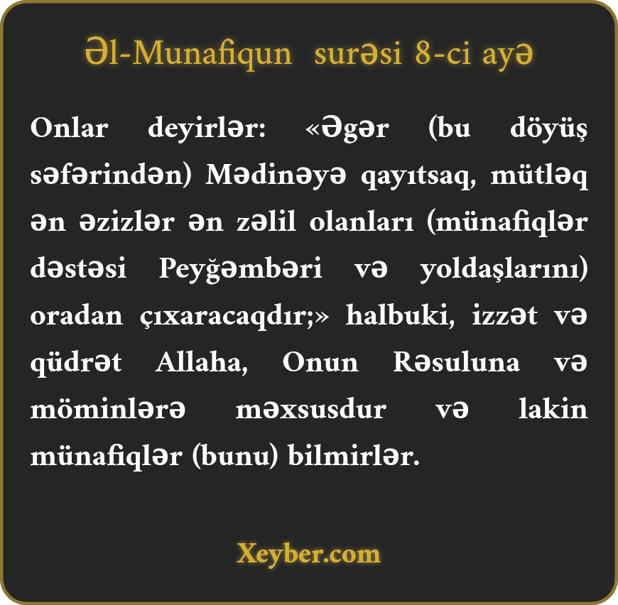 Onlar deyirlər: «Əgər (bu döyüş səfərindən) Mədinəyə qayıtsaq, mütləq ən əzizlər ən zəlil olanları (münafiqlər dəstəsi Peyğəmbəri və yoldaşlarını) oradan çıxaracaqdır;» halbuki, izzət və qüdrət Allaha, Onun Rəsuluna və möminlərə məxsusdur və lakin münafiqlər (bunu) bilmirlər.