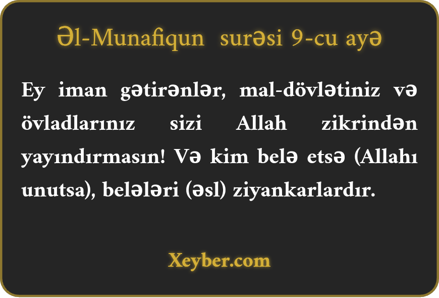Ey iman gətirənlər, mal-dövlətiniz və övladlarınız sizi Allah zikrindən yayındırmasın! Və kim belə etsə (Allahı unutsa), belələri (əsl) ziyankarlardır.