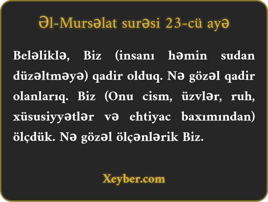 Beləliklə, Biz (insanı həmin sudan düzəltməyə) qadir olduq. Nə gözəl qadir olanlarıq. Biz (Onu cism, üzvlər, ruh, xüsusiyyətlər və ehtiyac baxımından) ölçdük. Nə gözəl ölçənlərik Biz.