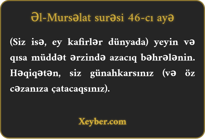 (Siz isə, ey kafirlər dünyada) yeyin və qısa müddət ərzində azacıq bəhrələnin. Həqiqətən, siz günahkarsınız (və öz cəzanıza çatacaqsınız).