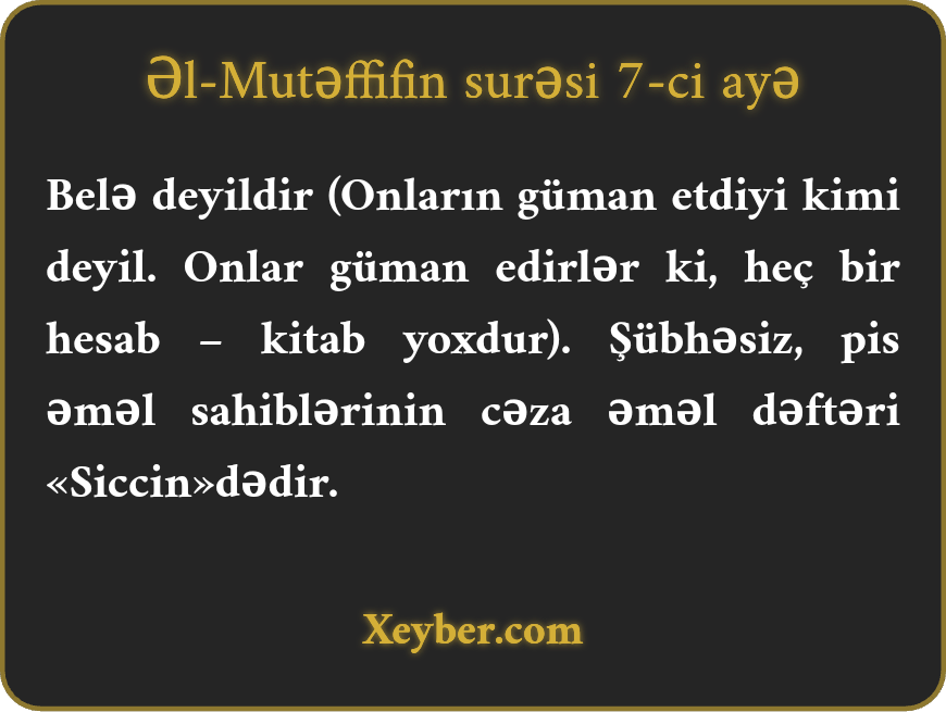 Belə deyildir (Onların güman etdiyi kimi deyil. Onlar güman edirlər ki, heç bir hesab – kitab yoxdur). Şübhəsiz, pis əməl sahiblərinin cəza əməl dəftəri «Siccin»dədir.