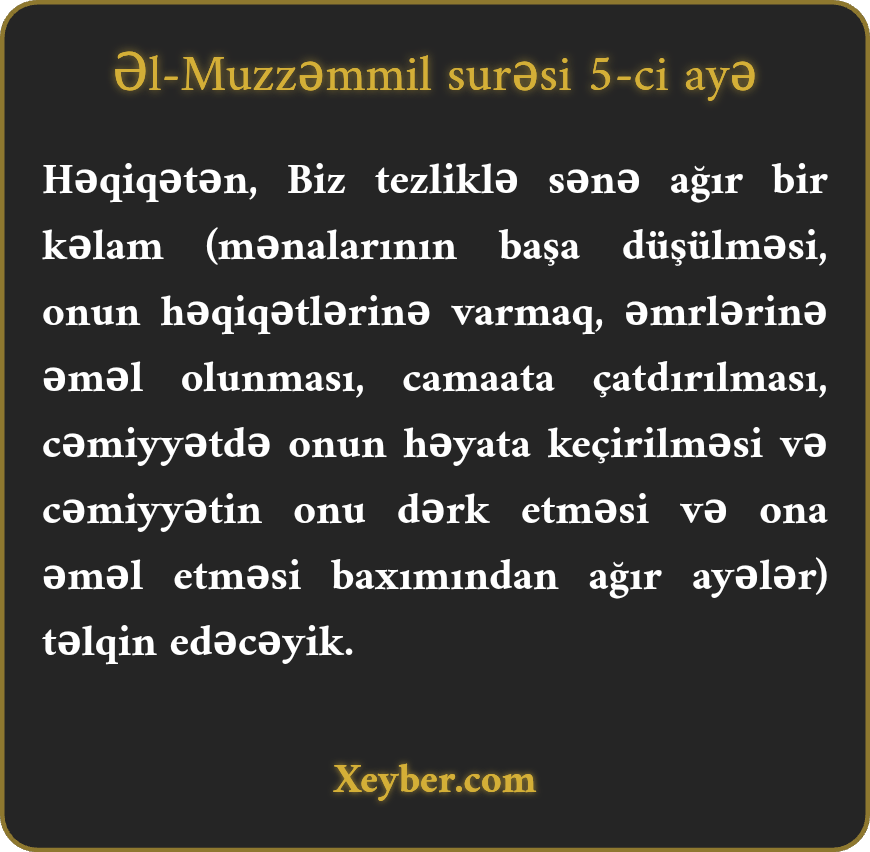 Həqiqətən, Biz tezliklə sənə ağır bir kəlam (mənalarının başa düşülməsi, onun həqiqətlərinə varmaq, əmrlərinə əməl olunması, camaata çatdırılması, cəmiyyətdə onun həyata keçirilməsi və cəmiyyətin onu dərk etməsi və ona əməl etməsi baxımından ağır ayələr) təlqin edəcəyik.