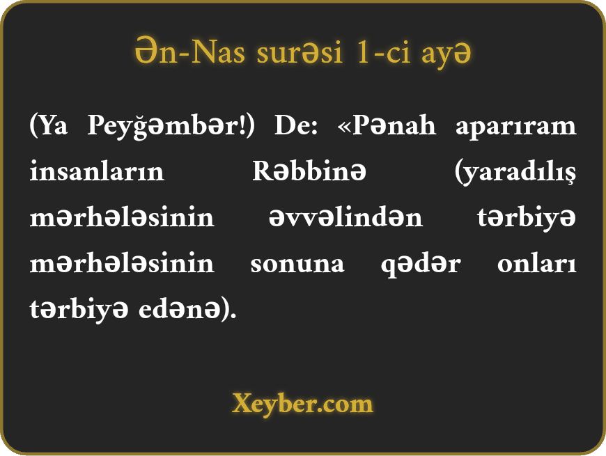 (Ya Peyğəmbər!) De: «Pənah aparıram insanların Rəbbinə (yaradılış mərhələsinin əvvəlindən tərbiyə mərhələsinin sonuna qədər onları tərbiyə edənə).
