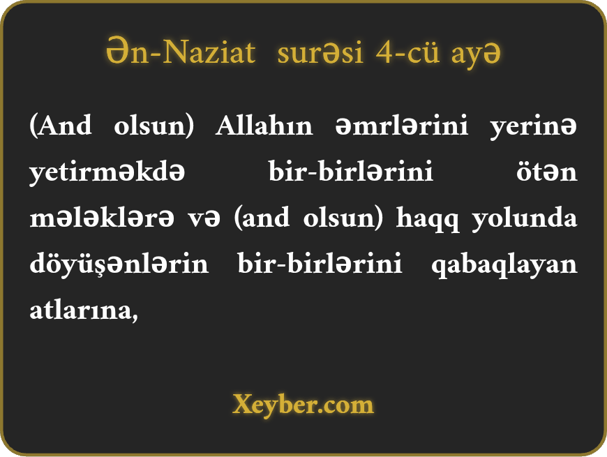 (And olsun) Allahın əmrlərini yerinə yetirməkdə bir-birlərini ötən mələklərə və (and olsun) haqq yolunda döyüşənlərin bir-birlərini qabaqlayan atlarına,