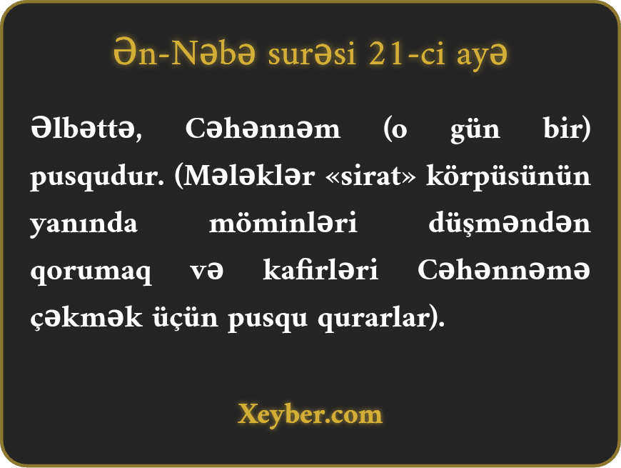 Əlbəttə, Cəhənnəm (o gün bir) pusqudur. (Mələklər «sirat» körpüsünün yanında möminləri düşməndən qorumaq və kafirləri Cəhənnəmə çəkmək üçün pusqu qurarlar).