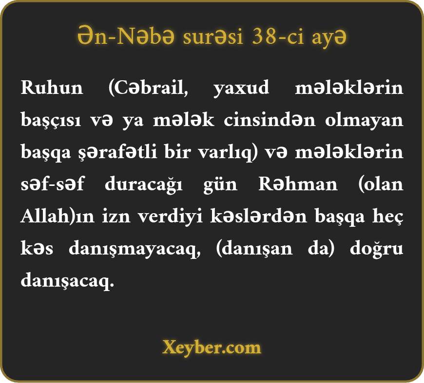 Ruhun (Cəbrail, yaxud mələklərin başçısı və ya mələk cinsindən olmayan başqa şərafətli bir varlıq) və mələklərin səf-səf duracağı gün Rəhman (olan Allah)ın izn verdiyi kəslərdən başqa heç kəs danışmayacaq, (danışan da) doğru danışacaq.