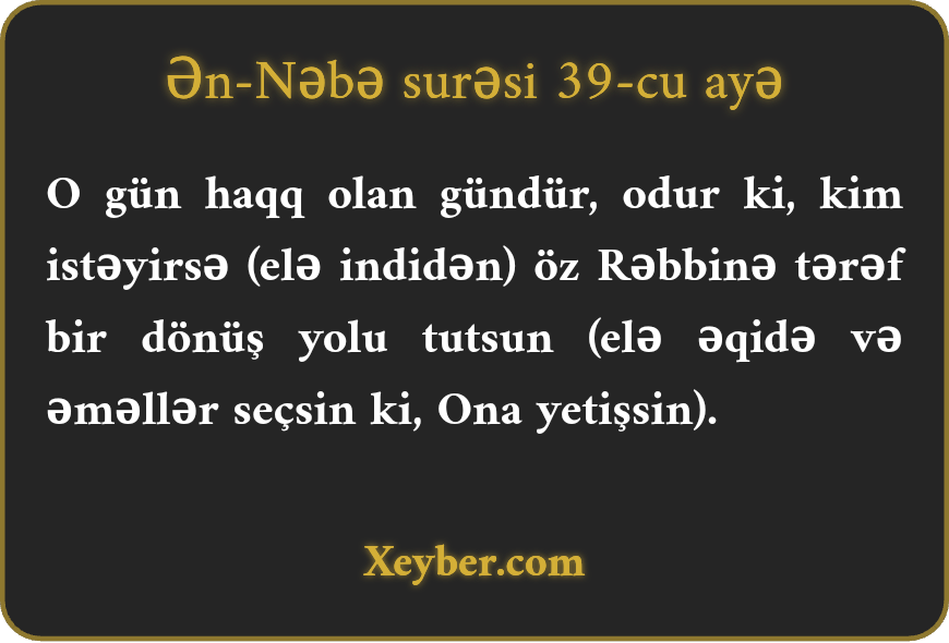 O gün haqq olan gündür, odur ki, kim istəyirsə (elə indidən) öz Rəbbinə tərəf bir dönüş yolu tutsun (elə əqidə və əməllər seçsin ki, Ona yetişsin).