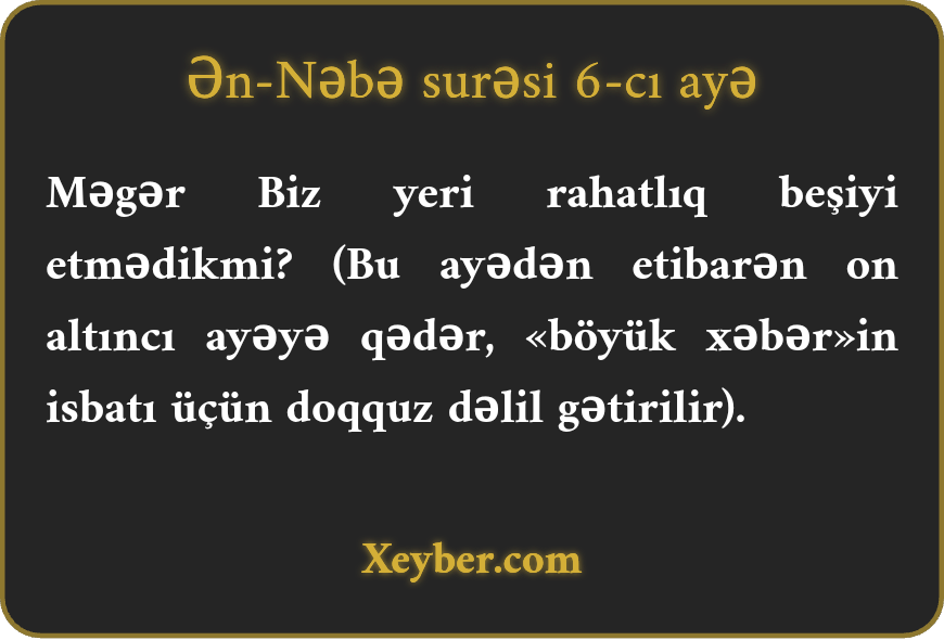 Məgər Biz yeri rahatlıq beşiyi etmədikmi? (Bu ayədən etibarən on altıncı ayəyə qədər, «böyük xəbər»in isbatı üçün doqquz dəlil gətirilir).