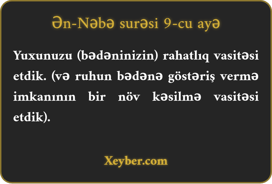Yuxunuzu (bədəninizin) rahatlıq vasitəsi etdik. (və ruhun bədənə göstəriş vermə imkanının bir növ kəsilmə vasitəsi etdik).
