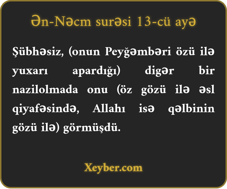 Şübhəsiz, (onun Peyğəmbəri özü ilə yuxarı apardığı) digər bir nazilolmada onu (öz gözü ilə əsl qiyafəsində, Allahı isə qəlbinin gözü ilə) görmüşdü.