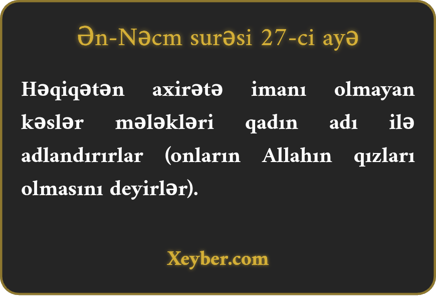 Həqiqətən axirətə imanı olmayan kəslər mələkləri qadın adı ilə adlandırırlar (onların Allahın qızları olmasını deyirlər).