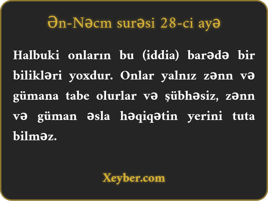Halbuki onların bu (iddia) barədə bir bilikləri yoxdur. Onlar yalnız zənn və gümana tabe olurlar və şübhəsiz, zənn və güman əsla həqiqətin yerini tuta bilməz.