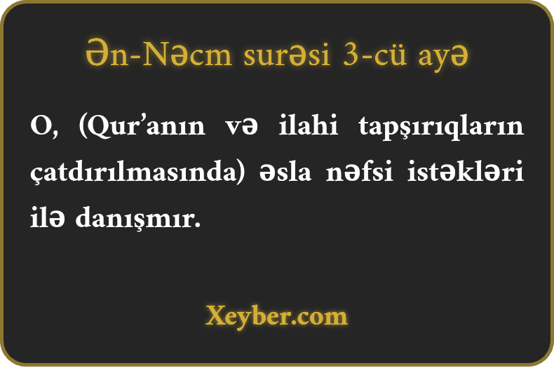 O, (Qur’anın və ilahi tapşırıqların çatdırılmasında) əsla nəfsi istəkləri ilə danışmır.