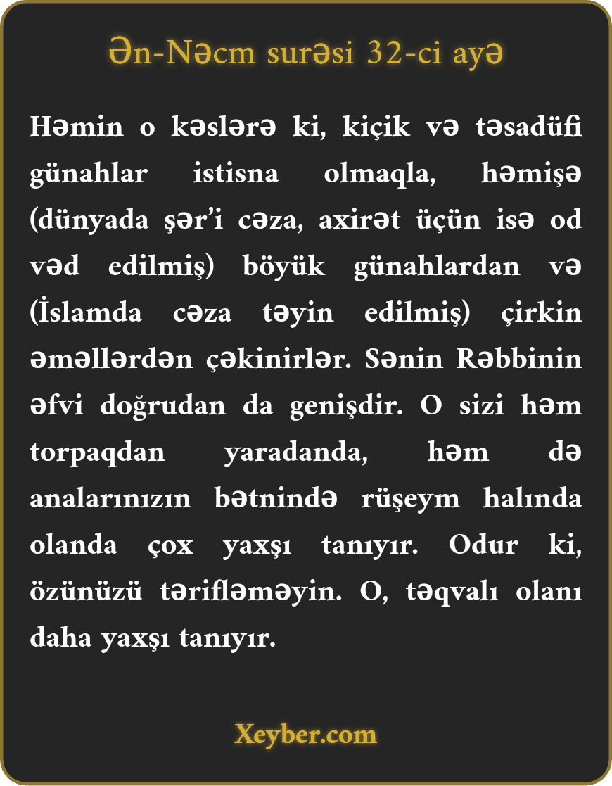 Həmin o kəslərə ki, kiçik və təsadüfi günahlar istisna olmaqla, həmişə (dünyada şər’i cəza, axirət üçün isə od vəd edilmiş) böyük günahlardan və (İslamda cəza təyin edilmiş) çirkin əməllərdən çəkinirlər. Sənin Rəbbinin əfvi doğrudan da genişdir. O sizi həm torpaqdan yaradanda, həm də analarınızın bətnində rüşeym halında olanda çox yaxşı tanıyır. Odur ki, özünüzü tərifləməyin. O, təqvalı olanı daha yaxşı tanıyır.