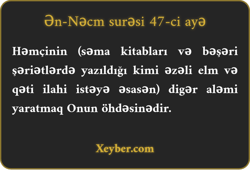 Həmçinin (səma kitabları və bəşəri şəriətlərdə yazıldığı kimi əzəli elm və qəti ilahi istəyə əsasən) digər aləmi yaratmaq Onun öhdəsinədir.