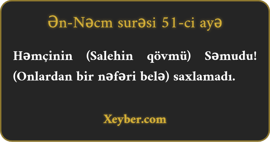 Həmçinin (Salehin qövmü) Səmudu! (Onlardan bir nəfəri belə) saxlamadı.