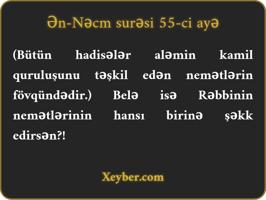 (Bütün hadisələr aləmin kamil quruluşunu təşkil edən nemətlərin fövqündədir.) Belə isə Rəbbinin nemətlərinin hansı birinə şəkk edirsən?!