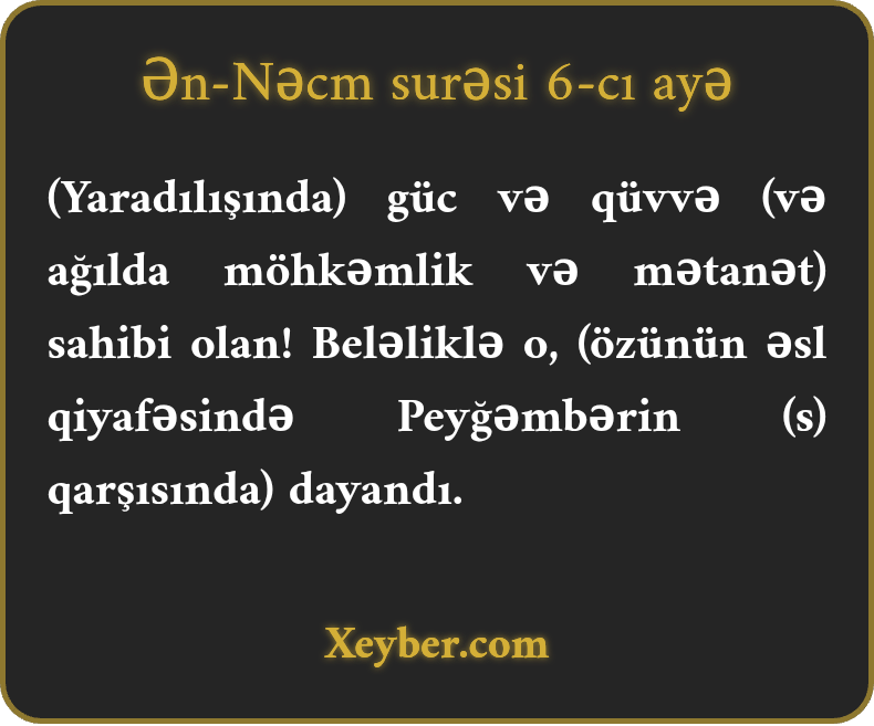 (Yaradılışında) güc və qüvvə (və ağılda möhkəmlik və mətanət) sahibi olan! Beləliklə o, (s">(özünün əsl qiyafəsində Peyğəmbərin (s) qarşısında) dayandı.
