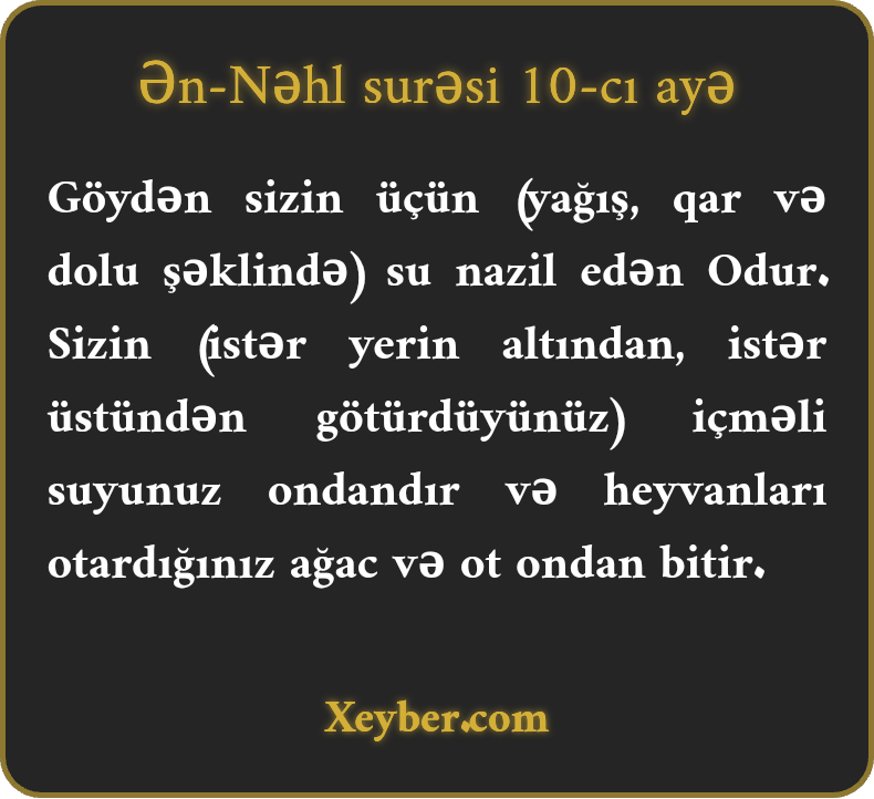"Sizin üçün səmadan su endirən Odur, içdiyiniz Ondandır. (Heyvanlarınızı) otardığınız otlar da Ondandır.”