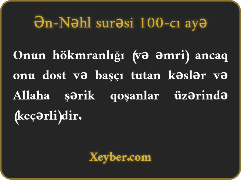 "Şeytan yalnız onun hakimiyyətini qəbul edənlərə hakim olur. Elə insanlar ki, onlar (şeytana aldanmaqla) Allaha şərik qoşmuşlar.”