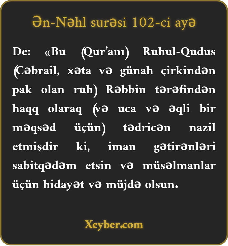 "De ki, onu (Quranı) Ruhul-qüdüs (Cəbrail) Rəbbin tərəfindən haqq olaraq, iman gətirənlərin sabitqədəmliyi, müsəlmanlara hidayət və müjdə üçün nazil edib.”