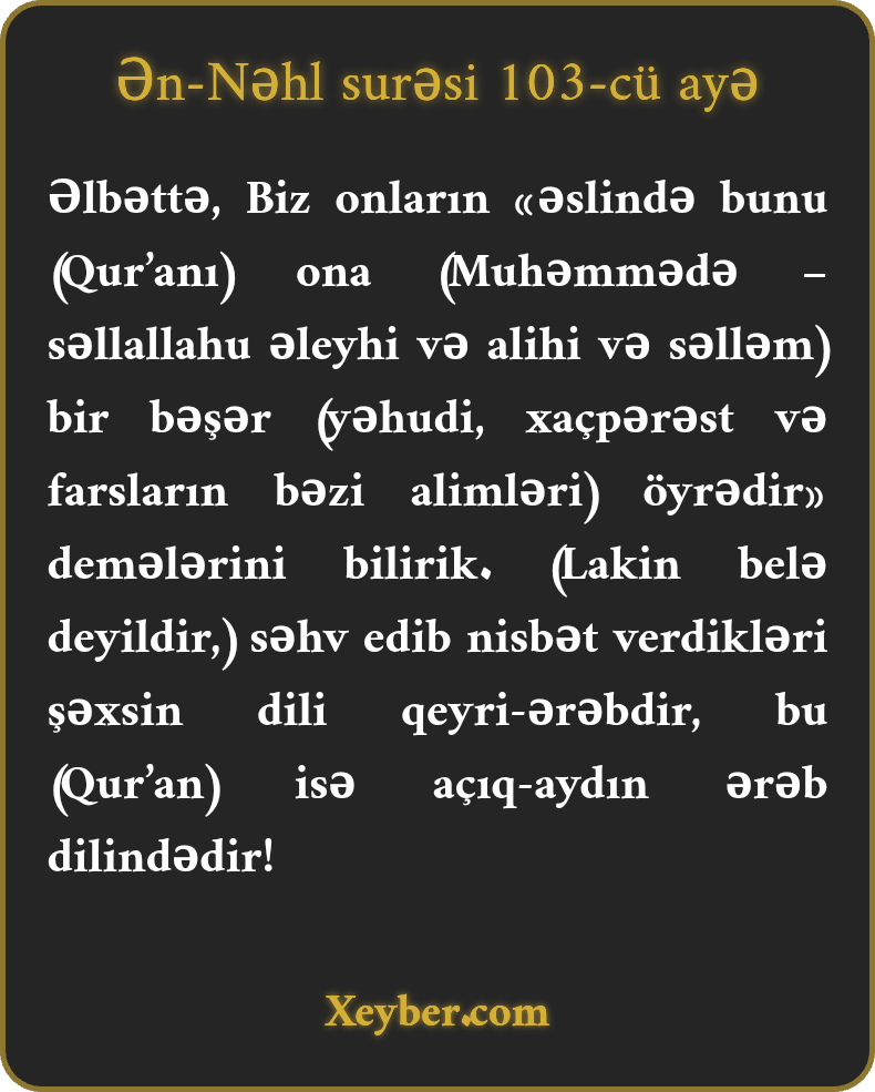 "Əlbəttə, Biz bilirik ki, sənin müxaliflərin deyir: "Bunu (Quranı) ona bir insan öyrədir və başqa cür ola bilməz. (Əslində belə deyil, çünki) onun (Quranın) aid edildiyi kəsin dili qeyri-ərəbi və yetərsizdir. Halbuki bu, (Quran) aydın ərəb dilindədir.”