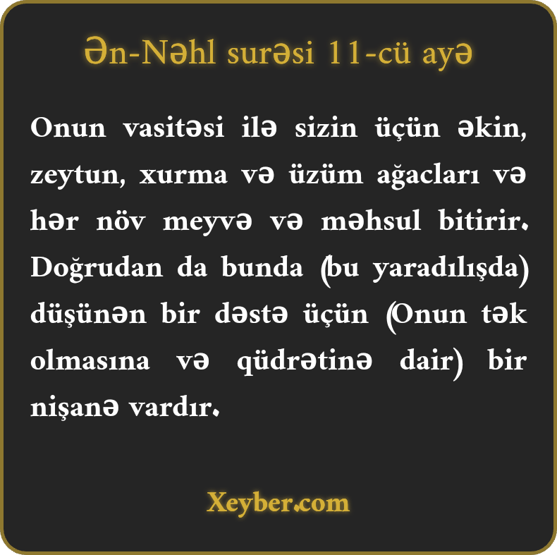 "Allah həmin su vasitəsi ilə sizin üçün əkinəcəklər, zeytun, xurma, üzüm və hər növ meyvə cücərdir. Həqiqətən, düşünən insanlar üçün bu işdə aşkar nişanələr var.”