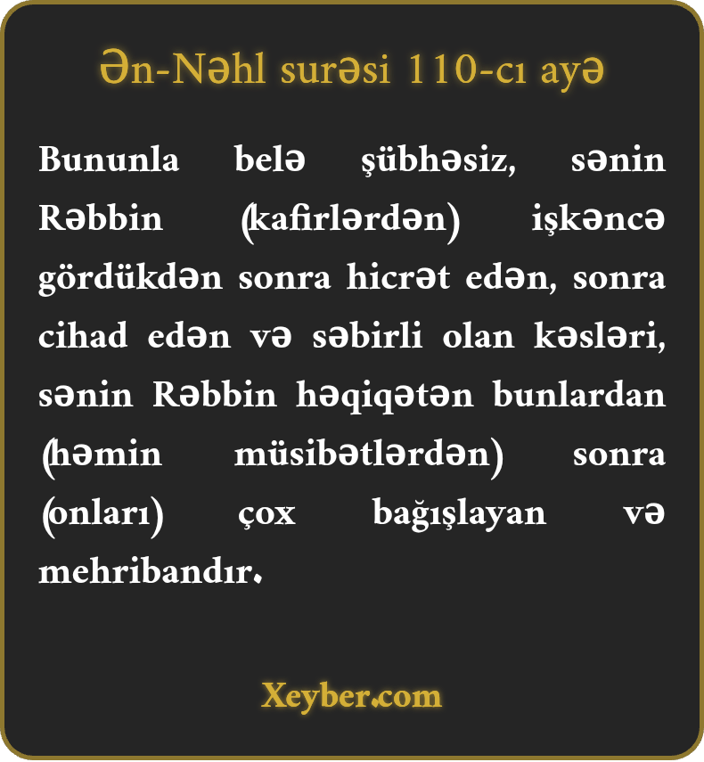 "Şübhəsiz, Rəbbin çətinliklərdən sonra hicrət edən və cihada qalxıb sabitqədəmlik göstərənlər üçün bağışlayan və mehribandır.”
