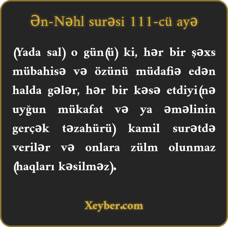 "Elə bir gün gələr ki, hər kəs yalnız özü haqqında düşünər və hər kəsə gördüyü işə görə cəza verilər. Onlara zülm olunmaz.”