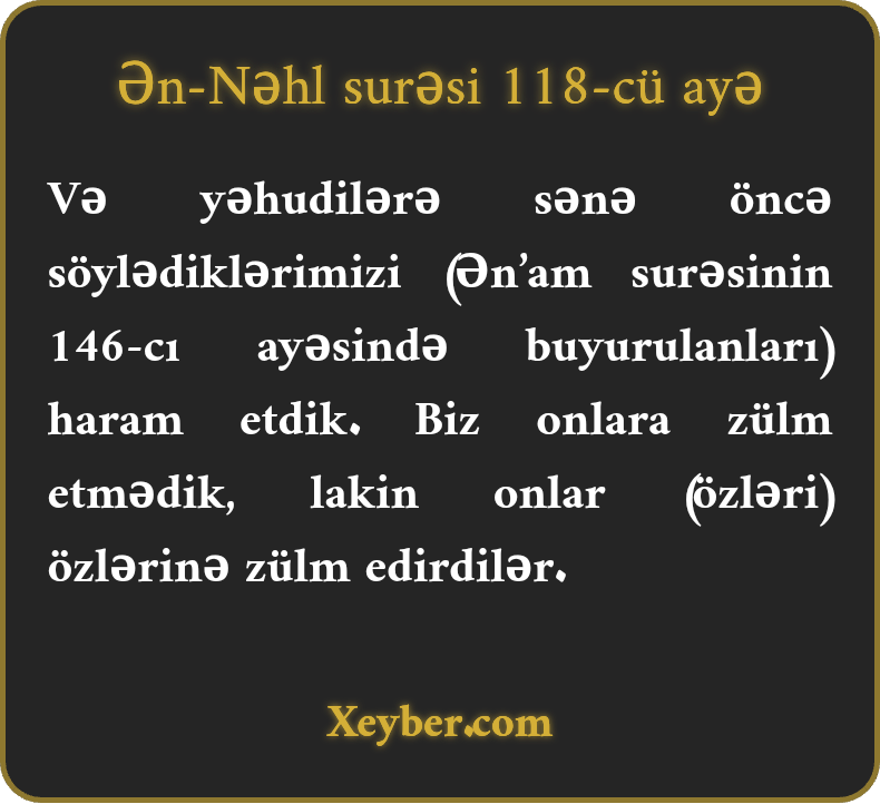 "Yəhudilərə bundan öncə sənə nəql etdiklərimizi haram buyurduq. ("Nəhl” surəsindən öncə nazil olunmuş "Ənam” surəsində bəyan olunan haramlardan əlavə, yəhudilərə cəza olaraq başqa qadağalar da qoyulmuş) (bu qadağalarla) onlara zülm etmədik. Bu onların özlərinə rəva qıldıqları zülm idi.”