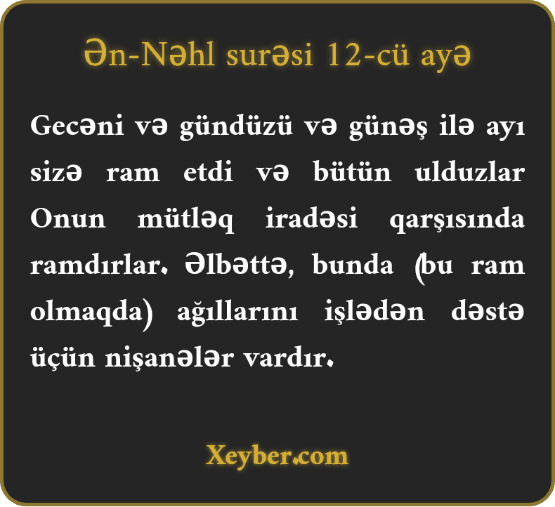 "O (Allah) gecə və gündüzü, günəş və ayı sizə xidmət və bəhrə vermək üçün qərarlaşdırdı. Ulduzlar Onun əmri ilə ram olmuşlar. Əlbəttə, bu işdə düşünən qrup üçün Onun qəti nişanələri var.”